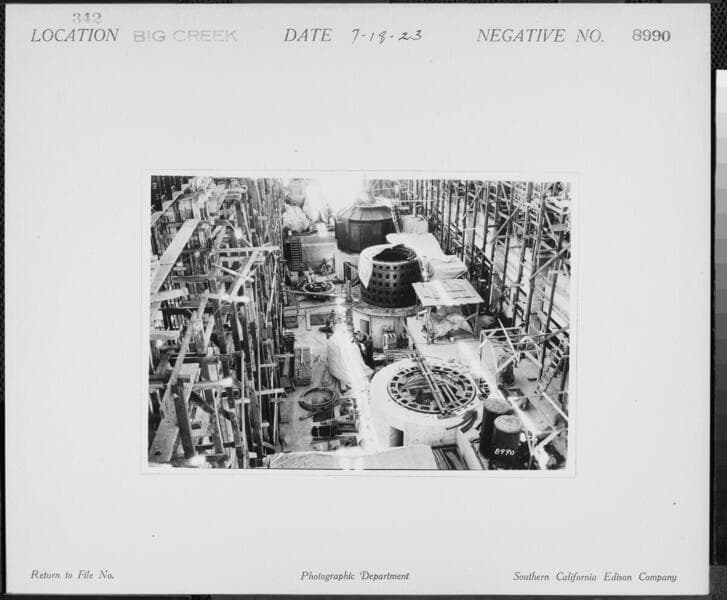 Big Creek Powerhouse #3 - Base ring set for Generator #3. Stator in place for Generator #2 and Generator #1 with steel housings.
