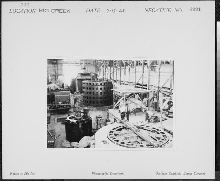 Big Creek Powerhouse #3 - Base ring set for Generator #3. Stator in place for Generator #2 and Generator #1 with steel housings.