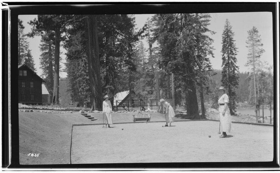Huntington Lake Lodge. Views of mountain scenery, recreation (fishing, boating, horseback riding, picnics, the lake, lodge guests, cart rides, croquet court, snow recreation, sledding, snowshoe hiking.
