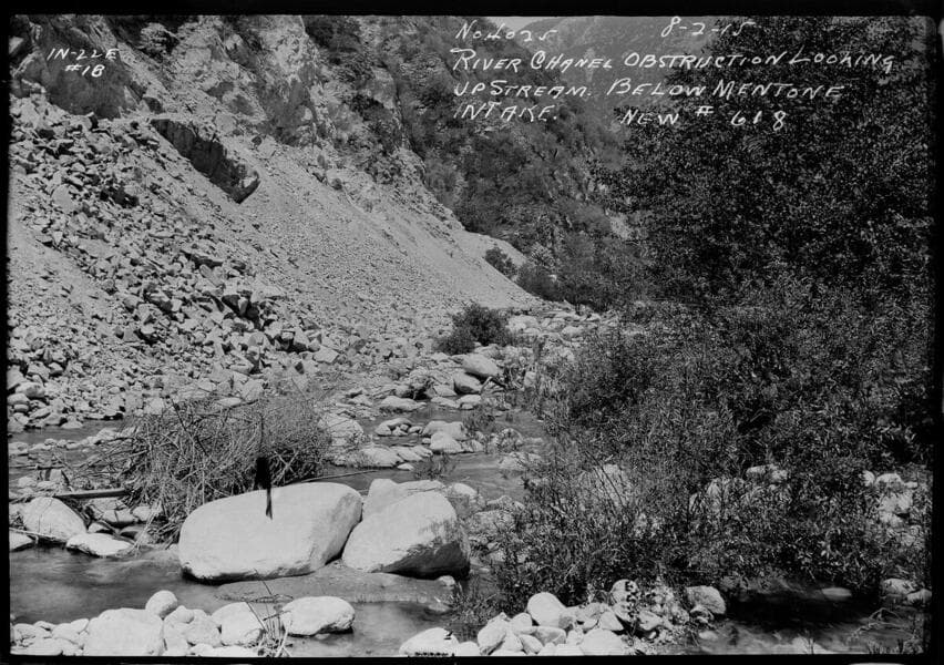 Mentone - Canyon near intake - View looking downstream immediately below intake showing obstruction in stream due to county road work.