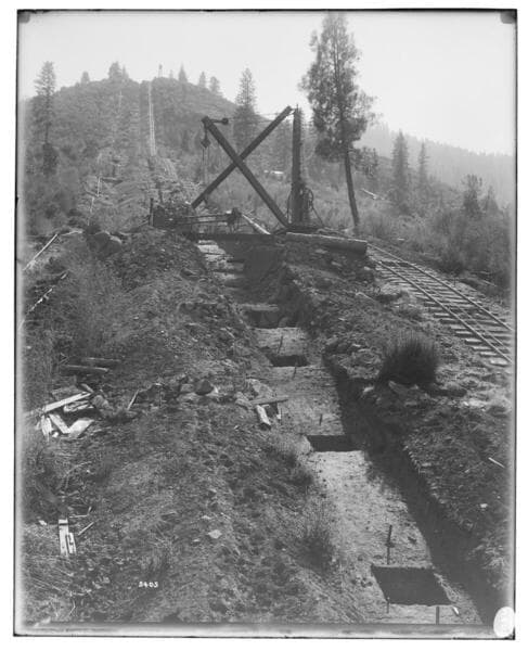 Big Creek PH #2 - [wooden crane being used along inclined railway above Powerhouse 2]