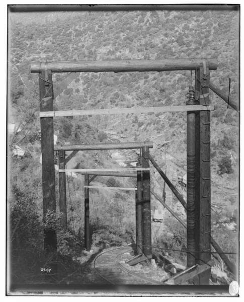 Big Creek PH #2 - [shot looking up inclined railroad with crane half way up. Forms being prepared for penstock placement.]