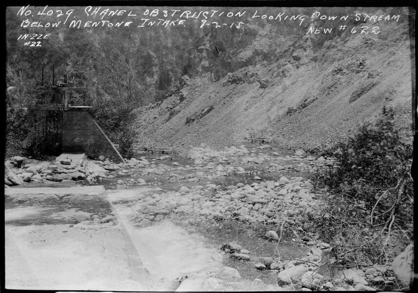 Mentone - Canyon near intake - View looking downstream from point above intake showing obstruction in stream due to county road work.