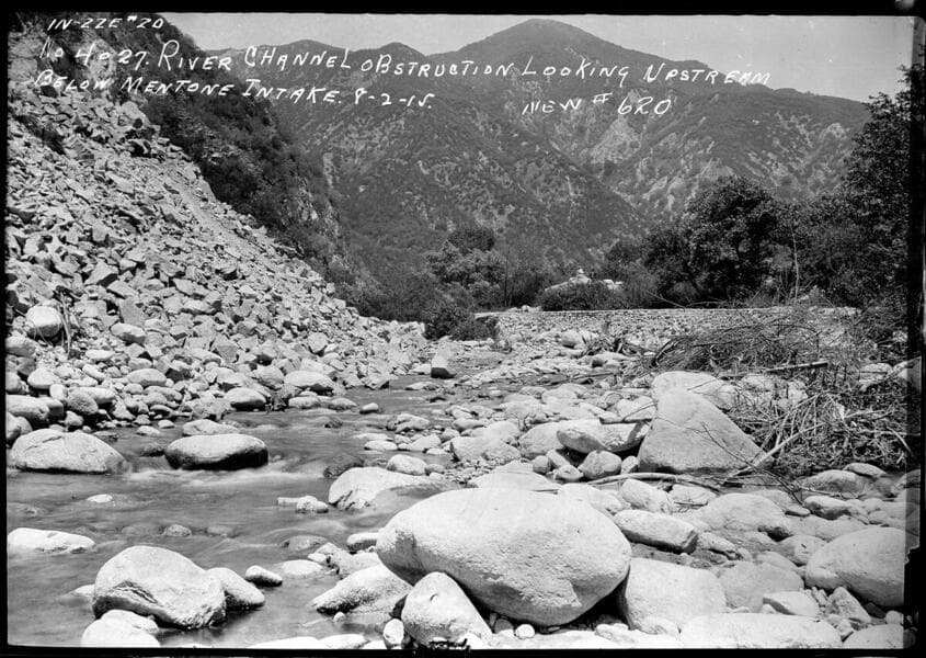 Mentone - Canyon near intake - View looking downstream from point above intake showing obstruction in stream due to county road work.