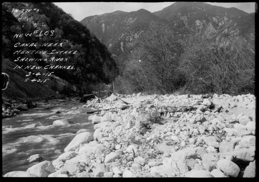 Mentone - Canyon near intake - View looking downstream showing obstruction in stream due to county road work, also showing good picture of canal at intake.