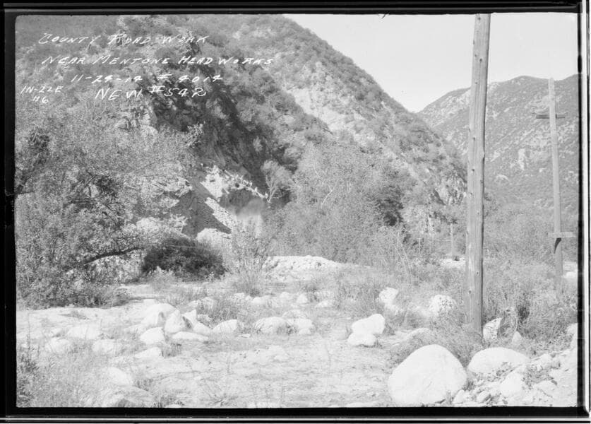 Mentone - Canyon near intake - View looking downstream from point above intake showing obstruction in stream due to county road work.