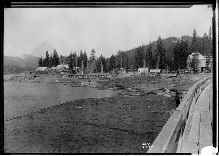 Big Creek Huntington Lake Dams - Upper end of Huntington Lake [2 men, 4 women and 1 child in two boats next to a raft of logs].