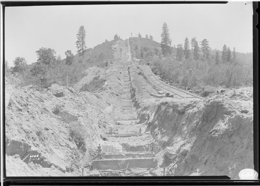 Big Creek PH #2 - [shot looking up inclined railroad with crane half way up. Forms being prepared for penstock placement.]
