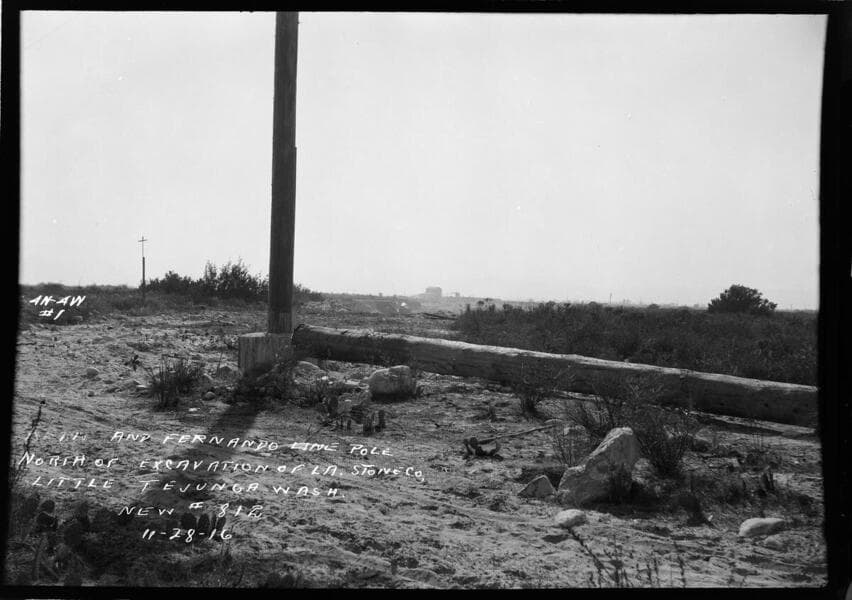 Transmission Line - San Fernando-Eagle Rock Pole in Little Tejunga Wash - looking up-stream - Showing pole North of excavation of L. A. Stone Co.