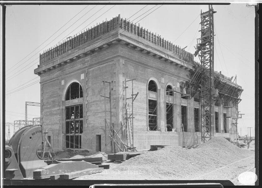 Vestal Substation - Operator's cottages and boarding house [under construction. - construction camp tent cabins in foreground]