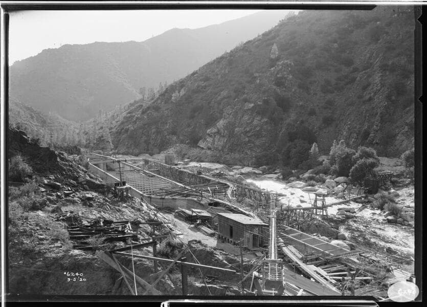 Kern River No. 3 - Fairview Dam, intake, and Sandbox during construction.