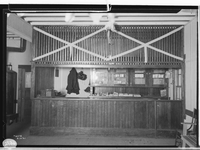 Big Creek, San Joaquin & Eastern Railroad - [Editor's party on SJ&E Railway, SJ&E passenger car 501, rail yard, construction work on railroad, Cascada Station; Auberry - machine shop, mess hall, commissary, & penstock staging area; Cascada - mail room, school house, commissary, mess hall after fire, gas tanks, offices, hospital, recreation hall, warehouse, dormitory, tennis court, boxing match, pole treating plant, building tunnel dump cars, building concrete gun pipes, dance party, laundry room, cookhouse, & 2 story bunkhouse; Camp 38 hospital; Clovis - cottages, water tanks, & sawmill; Sled Dog Team, and horse drawn sleds; Camp 62 - Telegraph room; Camp 63 radio equipment; Camp 3 radio room]