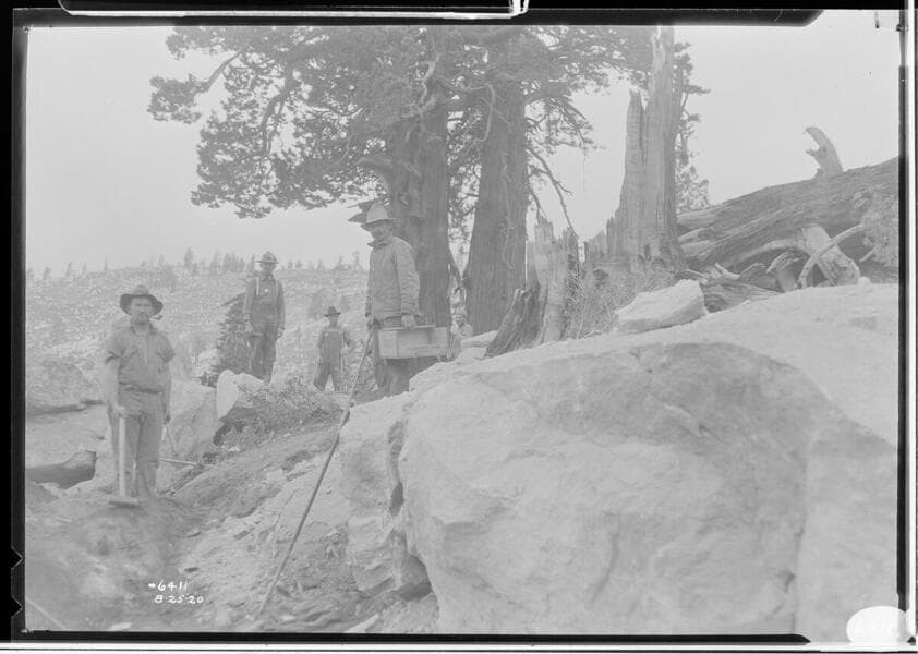 Big Creek, Florence Lake Dam - Men with shovels clearing snow from road over Kaiser Pass