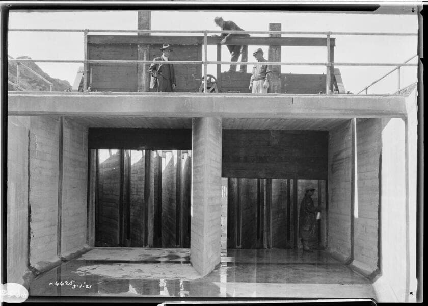 Kern River No. 3 - Men inside the large KR3 Sandbox showing baffels.