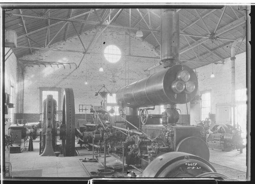 Plant Engineer Milton Nicholson stands by the Corliss engine at the Oxnard Steam Plant, about 1910