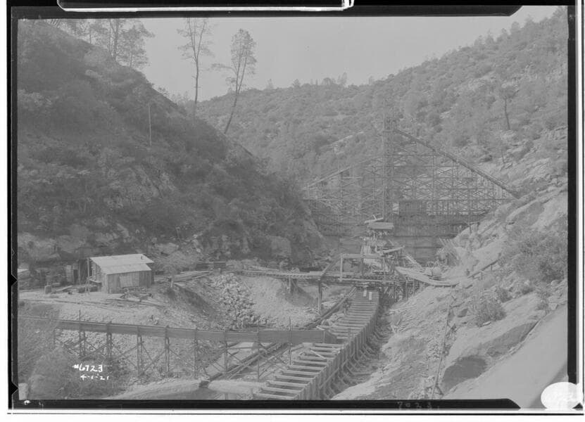 Big Creek Powerhouse #8 - View of Camp 33, Powerhouse #8, and Dam #6 at the peak of PH8 construction. Work just started on Tunnel 3 Intake structure.