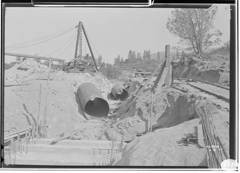 Big Creek Powerhouse 8 - Sections of penstock laid out in ditch along railroad.
