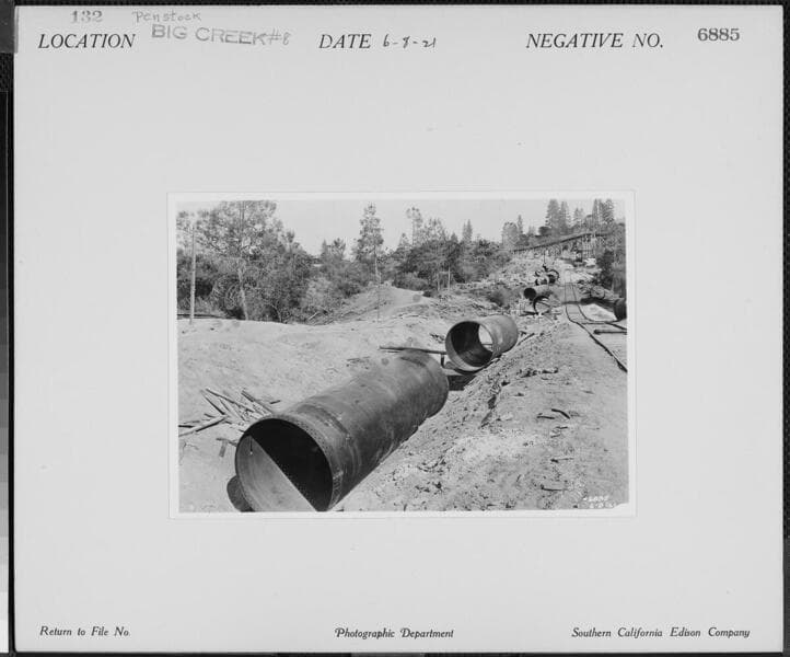 Big Creek Powerhouse 8 - Sections of penstock laid out in ditch along railroad.