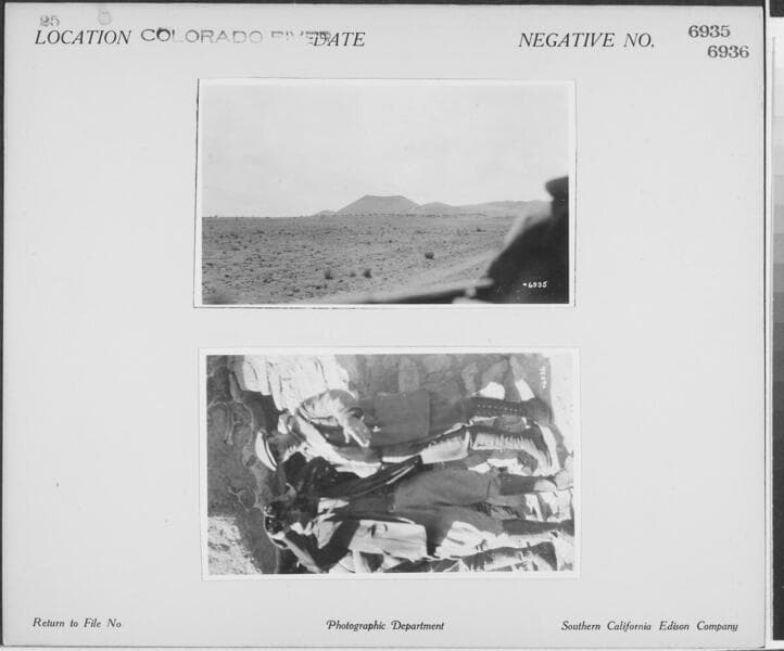 Colorado River - [shot of desert floor] - [additional shot with men standing outside their touring car in the desert (SCE 7020) on same photocard]