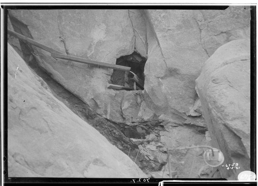 Portal Powerhouse - Portal Forebay - Bottom of vertical shaft in adit, shows upper portion of concrete bulkhead in adit.