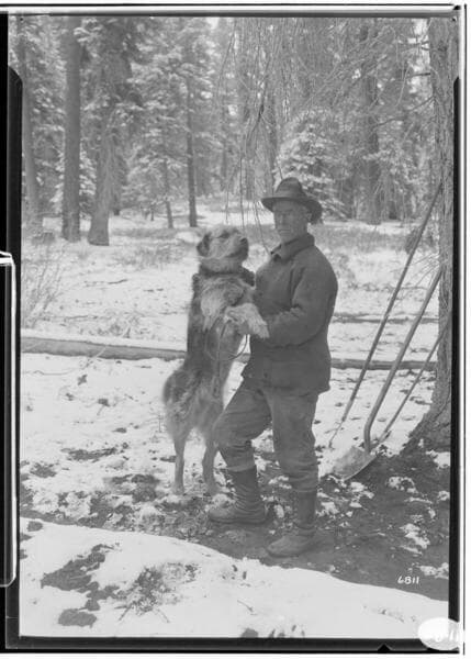 P1.2 - Portraits, misc. - Jerry Dwyer with one of his sled dogs. There is some snow on the ground.