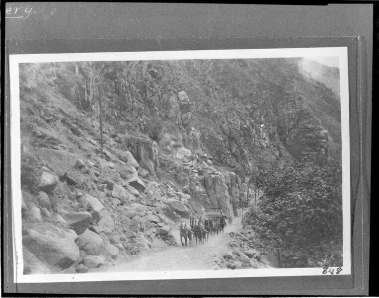 A section of penstock for Kern River #1 Hydro Plant being hauled up the trail in Kern River Canyon by a team of horses