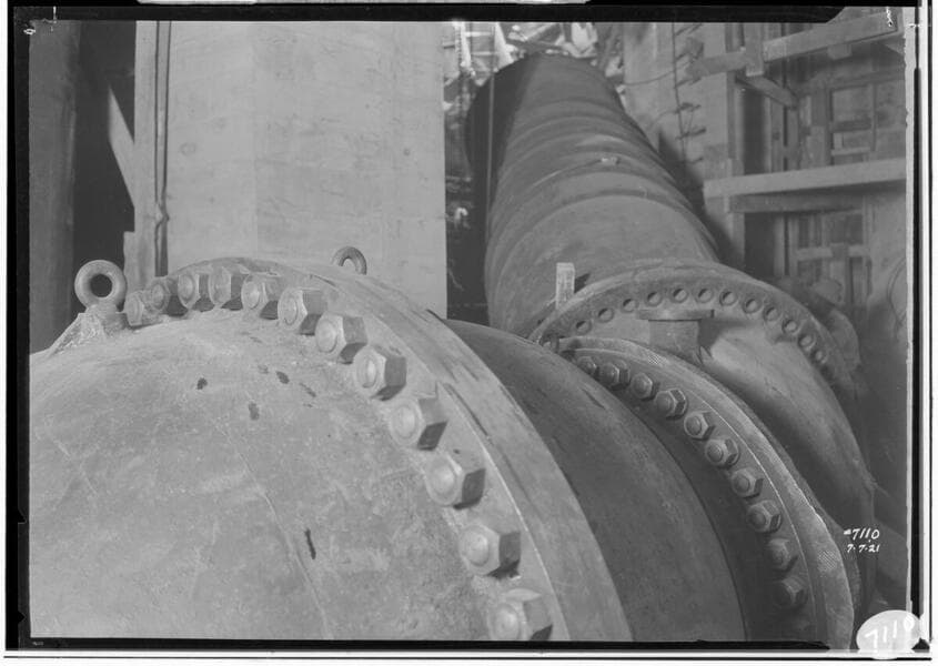 Powerhouse No. 8, Part Two. Photographs of Powerhouse 8 diversion, excavation for powerhouse, diversion tunnel construction, interior shots of Powerhouse No. 8 (transformers, control room, turbine-generator assembly, station power, Johnson Valve, turbine runner, crane assembly, scroll case assembly, draft tube); Penstock rupture - ripped Penstock, flattened pipe, damage to powerhouse and other facilities, reshaping pipe, adding reinforcing bands to high stress sections of penstock; Camp 33, operator dormitory, substation, incline construction.