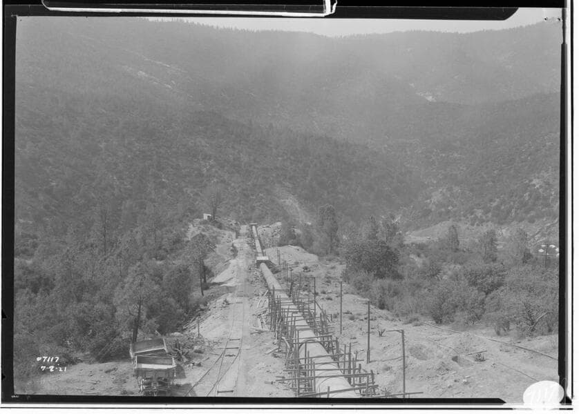 Powerhouse 8 [with steel framework completed] - Looking down penstock pathway [with forms for concrete penstock footings excavated and ready for pour.]