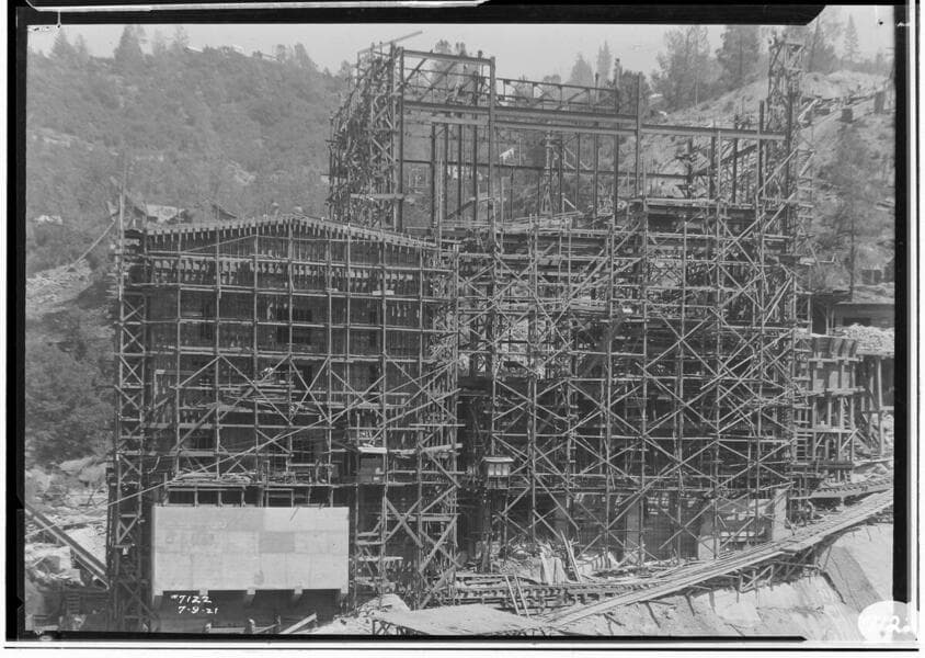 Big Creek Powerhouse #8 - Looking across Big Creek Channel towards Powerhouse. The lower section of the draft tube Unit #2 is being placed. Tailrace Cofferdam in lower right-hand corner. End of incline spur in upper right-hand corner.