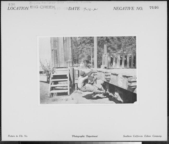 Big Creek Powerhouse #3 - Penstock #3 pipe sections brought in on transcontinental flatcars and unloaded at railroad yard in Auberry. They were then taken to Big Creek on the SJ&E RR.