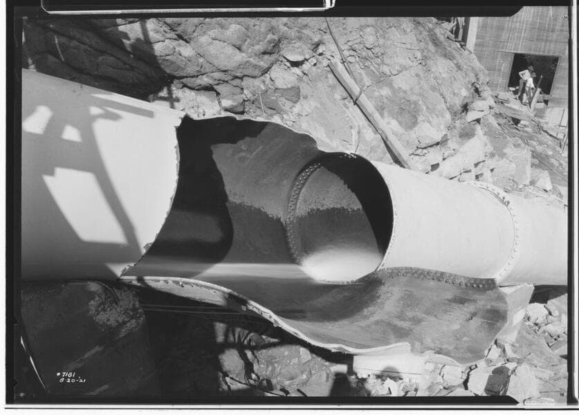 Big Creek - Break in pressure main at 5am (8/20/1921) [Huge section of the 1.12 inch thick steel penstock ripped like cardboard.]