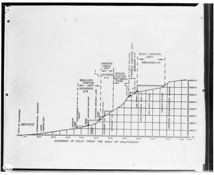Colorado River - Profile graphic of 1100 miles of the Colorado River from Green River to Gulf of California - showing proposed hydro generation.