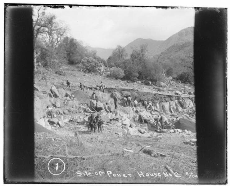 The construction site of Kaweah #2 Hydro Plant power house, showing them in the process of building the foundation, May 13, 1904.
