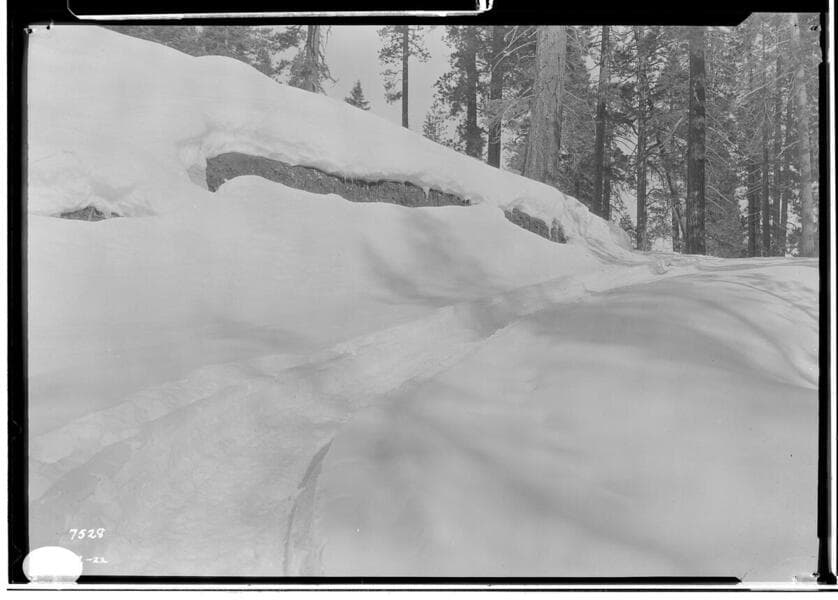 Big Creek, Florence Lake Dam - Snow road near Camp 61, Florence Lake project. Building at right is the sawmill.