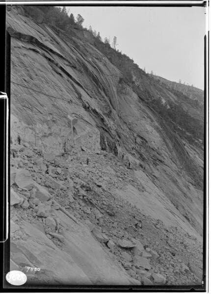 Big Creek, Miscellaneous - Road building - drilling crew near front of a heavy rock cut, Project 3 road, Lower San Joaquin Canyon. [Crew is blasting granite cliff to construct road to Powerhouse #3.]