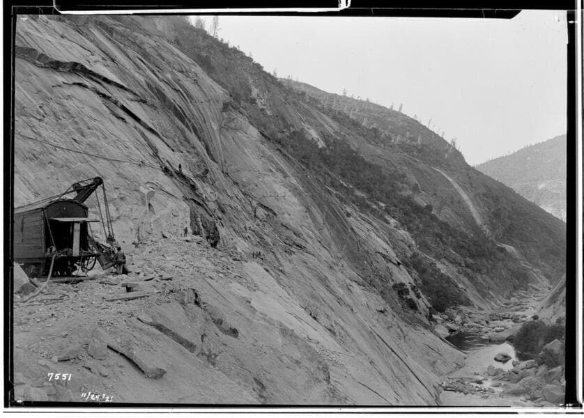 Big Creek, Miscellaneous - Rock excavation on project 3 road, lower San Joaquin Canyon passing point in foreground. Marion model 40 steam shovel is working at the end of the road.