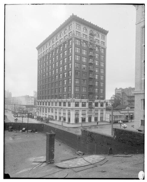 B1.1 - Buildings Miscellaneous - Los Angeles Trust & Savings Bank Building, [trolley cars, people, and a horse-drawn buggies on the street below]