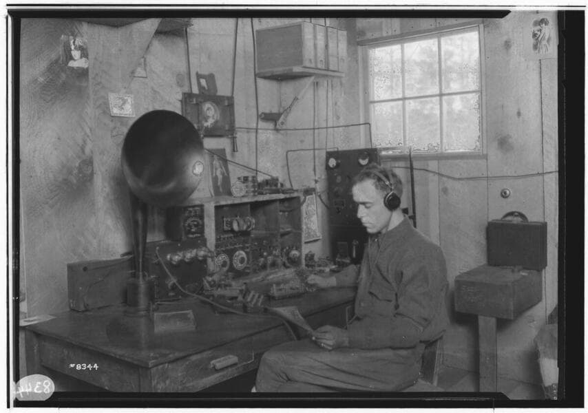 Big Creek, Florence Lake Dam - Radio operator at Big Creek, Camp 61C with 4 other men listening to Times Radio Contest.