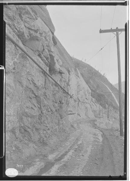 Big Creek Powerhouse #3 - Progress picture showing completed grading for upper row of houses 16 to 24 inclusive. Pipe for 6" water line strung out prior to trenching in road for installation.