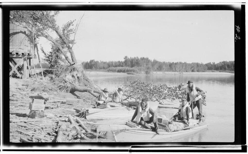 Colorado River Survey - [5 men surveying with transit at the rivers edge.]