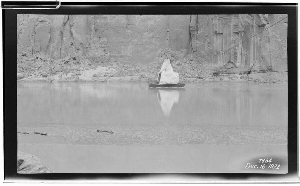 Colorado River - [a boat with tent is tethered in middle of deep river section with steep walls. Boat appears to be taking core samples along the river bottom for a new dam site with a diamond drill rig]