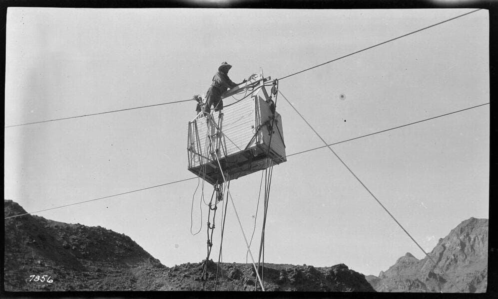 Colorado River expedition - no additional notes - Men setting up cable on bank spanning river