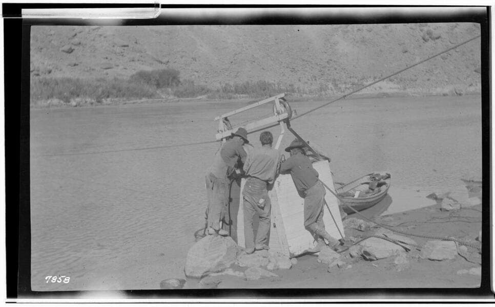 Colorado River expedition - no additional notes - Men setting up cable on bank spanning river