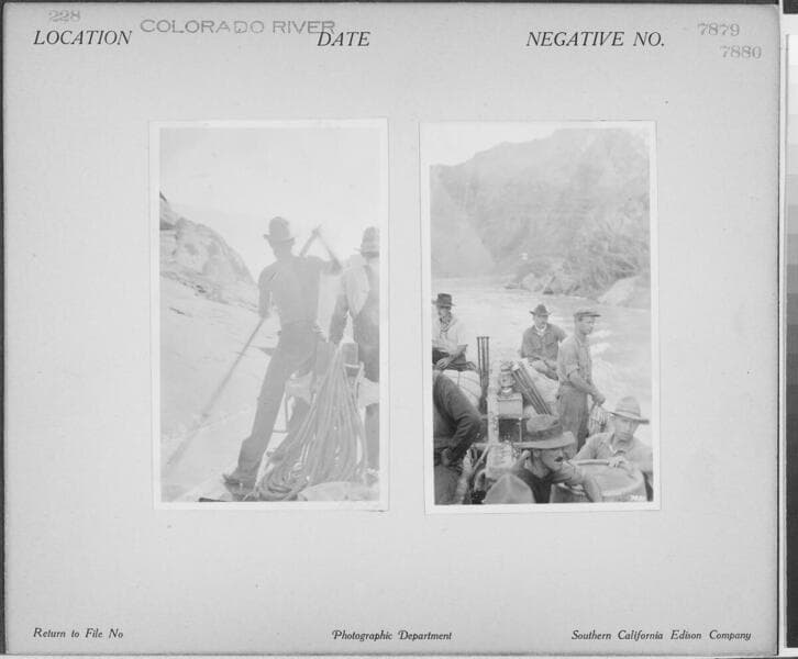 Colorado River - [Launching survey boat on Colorado River] - [plus three additional shots of launch, desertscape and bridge spanning river (SCE 7214, 7215, & 7216) on same photocard]