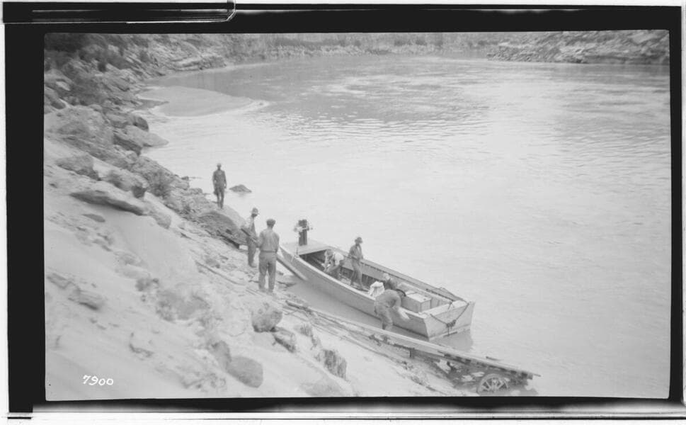 Men lowering one of the Colorado River Expedition boats down the bank to the Colorado River