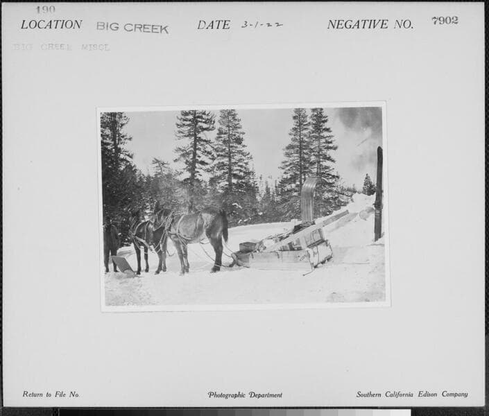 Big Creek, Miscellaneous - Snow boat leaving Camp 61. Tandem teams for hauling sleds between camps on the Florence Lake project.