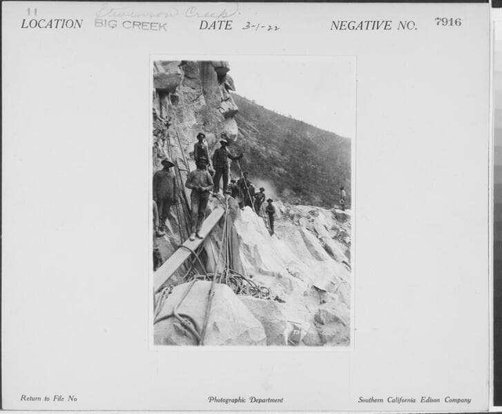 Big Creek, Stevenson Creek Test Dam - High Bluff near Stevenson Creek. Heavy rock cut in road construction for project 3, near camp 35.