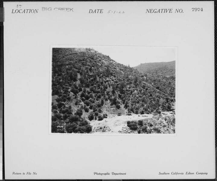 Big Creek Powerhouse #3 - Camp 37 and road. Brush cut on incline for Powerhouse #3 penstocks.