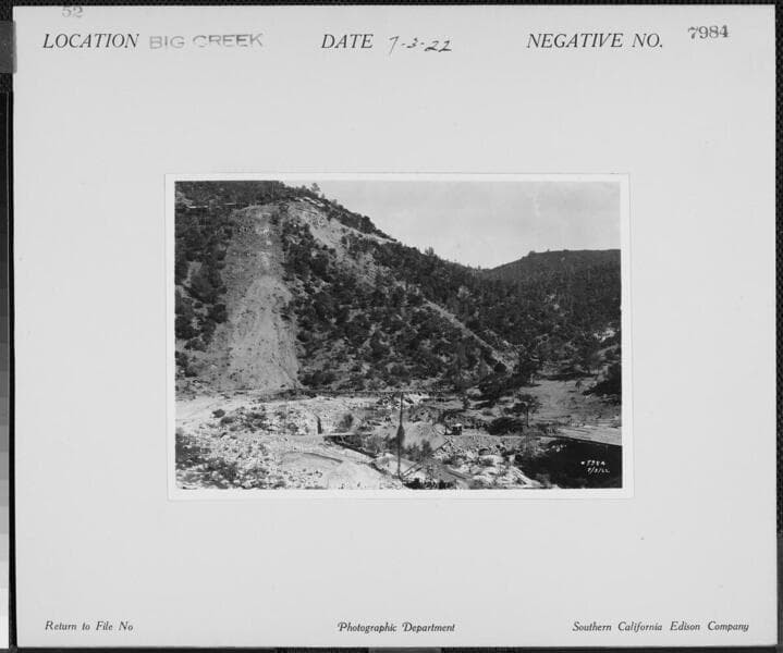 Big Creek Powerhouse #3 - Looking upstream at Dam #6 site. Steam shovel in foreground just starting sloping excavation for bed of dam which will be midway between shovels. On right is excavation on rock for dam to rest against.