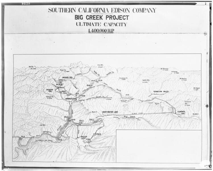"Birdseye View, Big Creek - San Joaquin River, Water Power Development of the Southern California Edison Co." Map/drawing shows the plans SCE had to expand the Big Creek project to 18 powerhouses, producing 1,460,000 kilowatts through 1943. The Depression, the construction of Hoover Dam, and World War II killed the ultimate completion of the planned expansion.